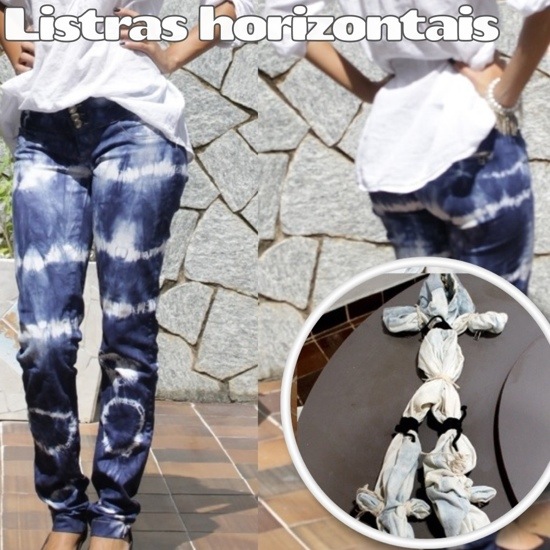 A essa altura do post, quem ainda não sabia já deve ter percebido que não tem muito segredo, né? O corante pega em qualquer parte que não estiver protegida pelo barbante ou elástico. Portanto, para fazer listras horizontais numa calça, por exemplo, você vai amarrar o jeans em vários pontos horizontalmente.