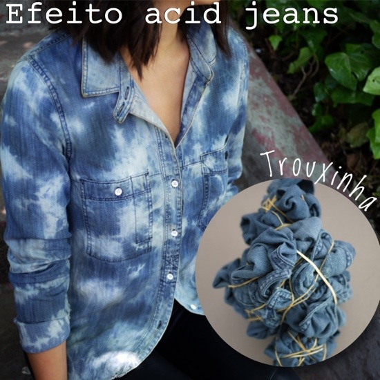 O efeito acid jeans é bem parecido com o marmorizado na sua técnica, porém pode haver algumas pequenas variações. Por exemplo, nesse abaixo ela enrolou algumas partes do jeans e saiu prendendo cada uma, até chegar num grande “bolo” e amarrar tudo.